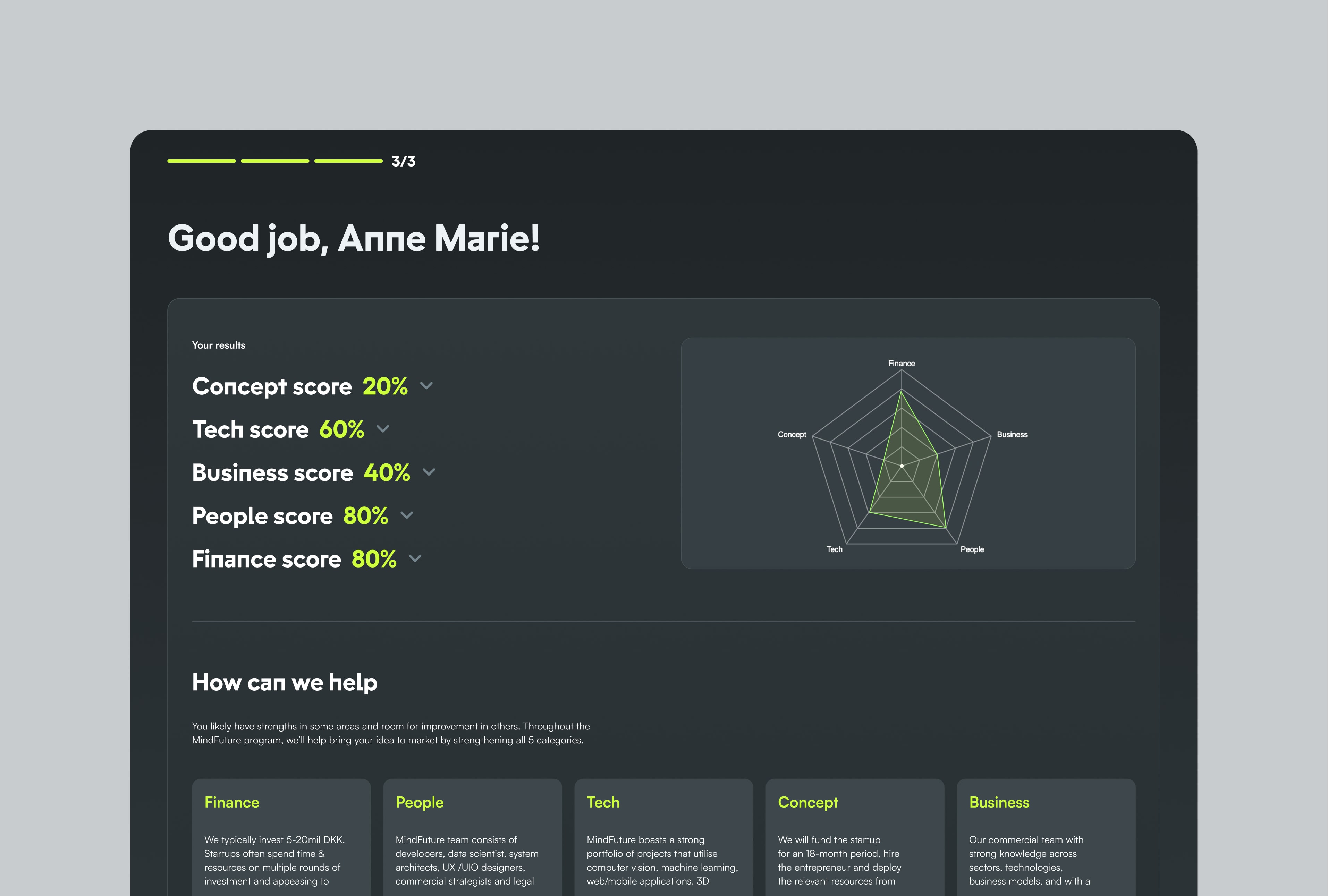 Feedback delivery: Category-specific guidance cards outline concrete next steps for each area and explain how MindFuture can help. Promising founders can move directly into the MF program application, using their assessment data.
